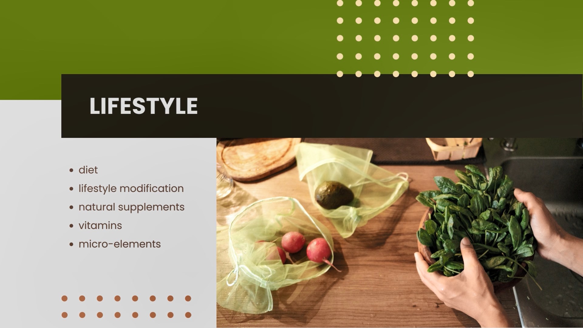 • Diet & lifestyle, natural supplements, vitamins, micro-elements