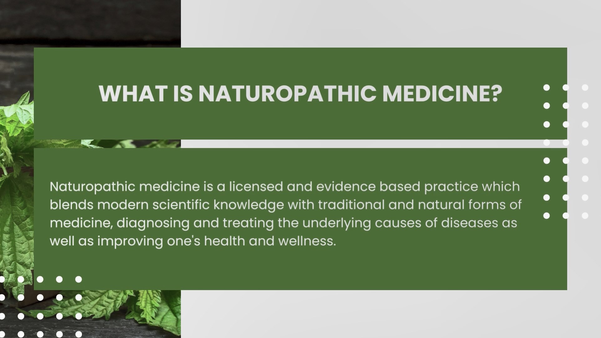 Naturopathic medicine blends modern scientific knowledge with traditional and natural forms of medicine, treating the underlying causes of diseases as well as improving one’s health and wellness.