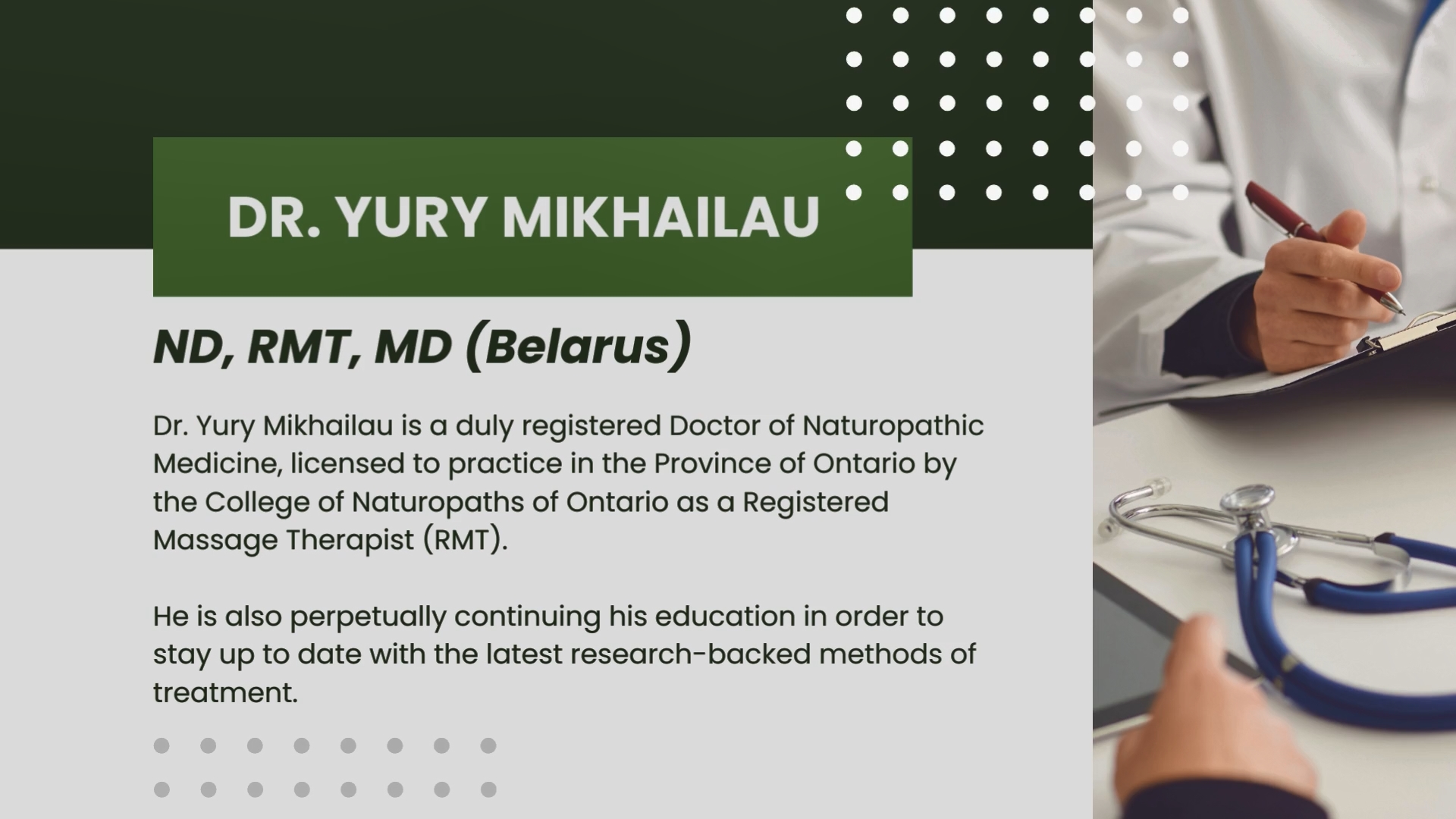 Dr. Yury Mikhailau is a duly registered Doctor of Naturopathic Medicine, licensed to practice in the Province of Ontario by the College of Naturopaths of Ontario.