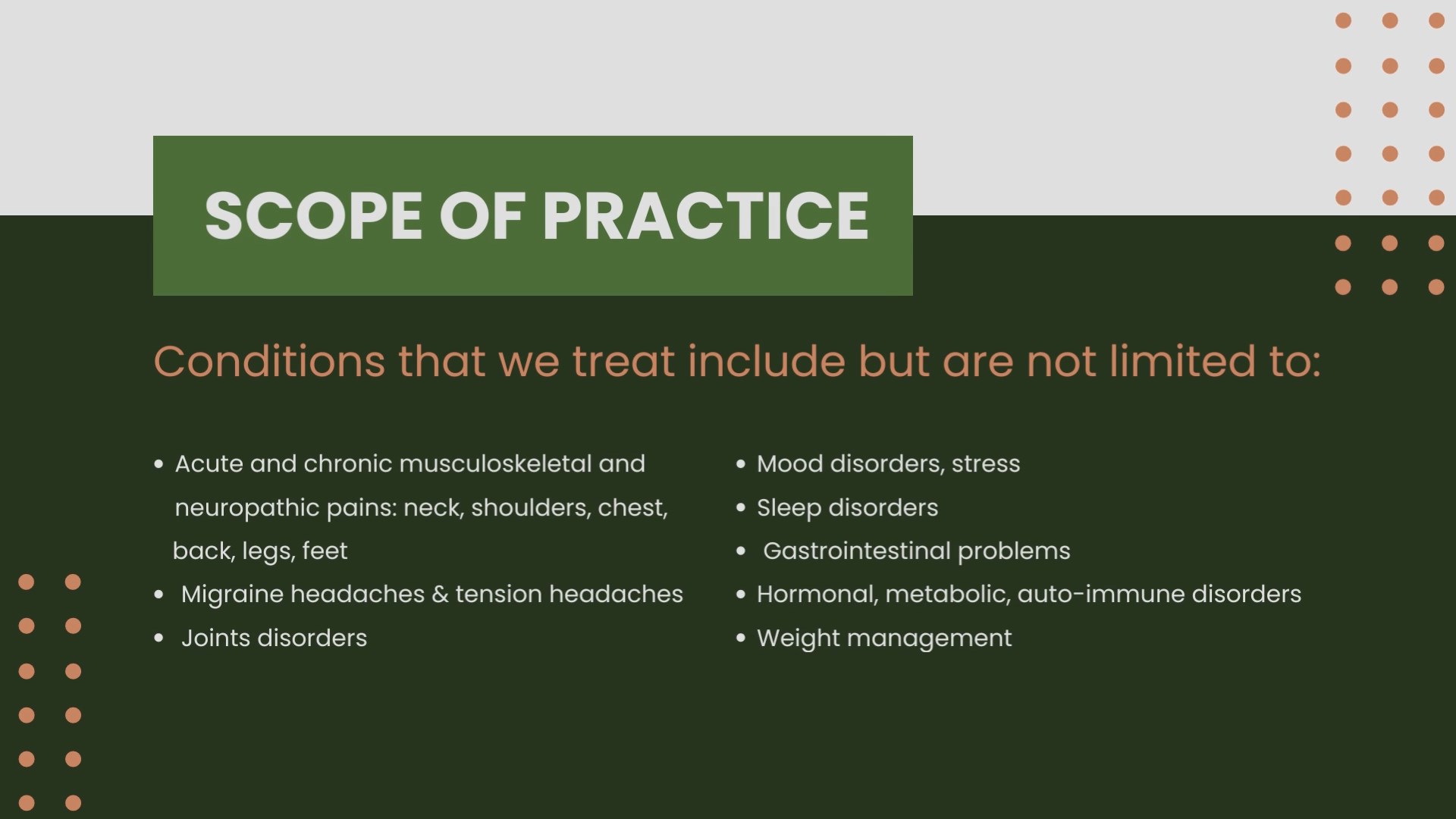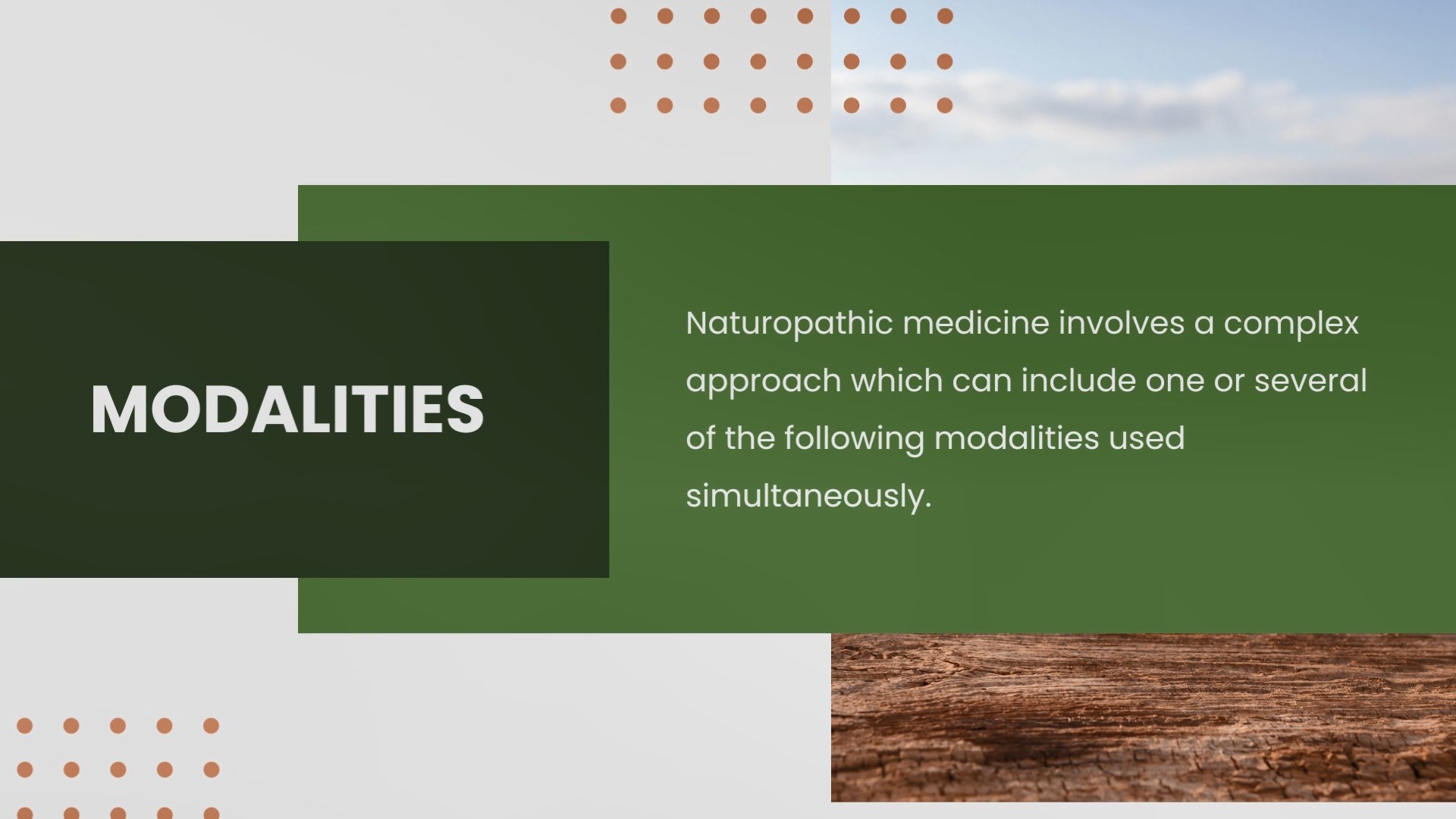 Naturopathic medicine is the art and science of disease diagnosis, treatment and prevention using natural therapies including: traditional Chinese medicine/acupuncture, botanical medicine, clinical nutrition, manual techniques (spinal and joints manipulation, joint mobilization, muscle release, therapeutic massage), cupping, hydrotherapy, remedial excercises, physical agents, homeopathy, life style counselling, health promotion and disease prevention.