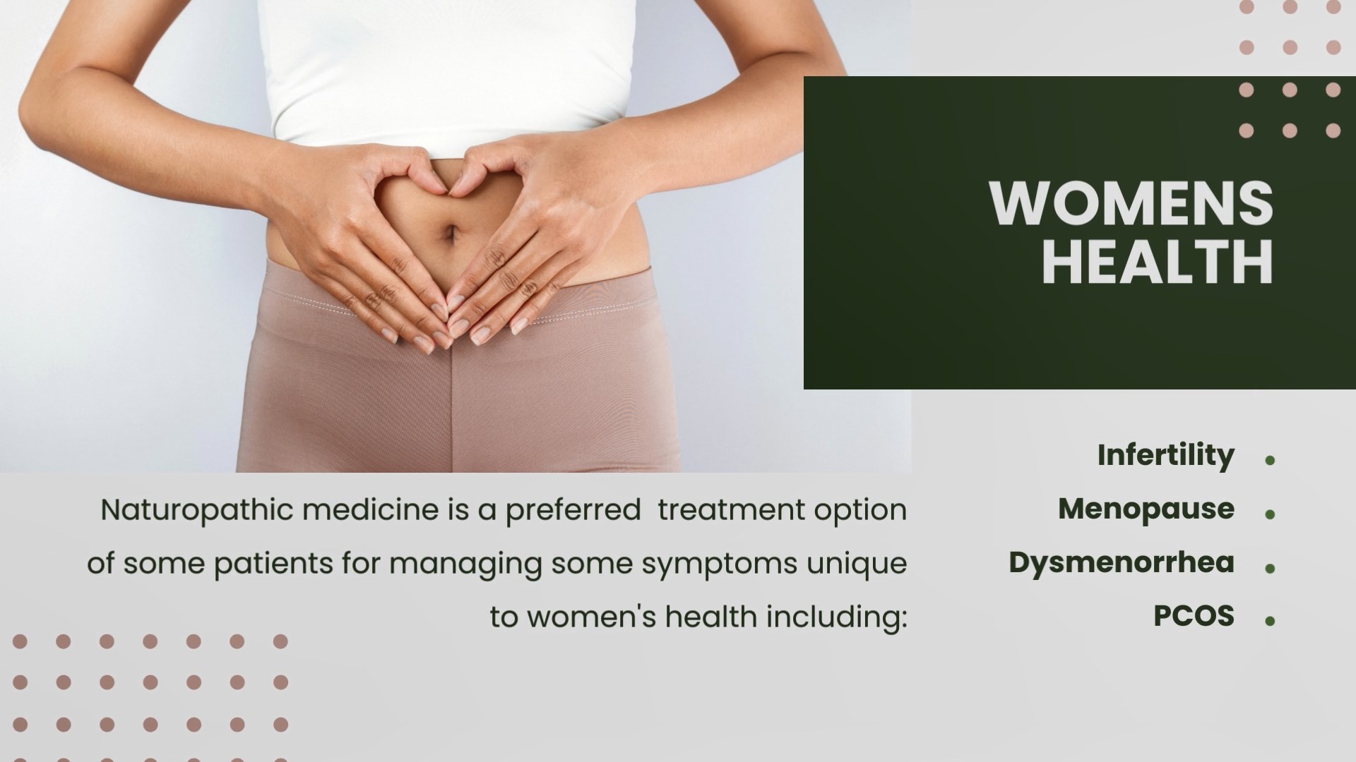 • Women's health: infertility, menopause, dysmenorrhea, PCOS