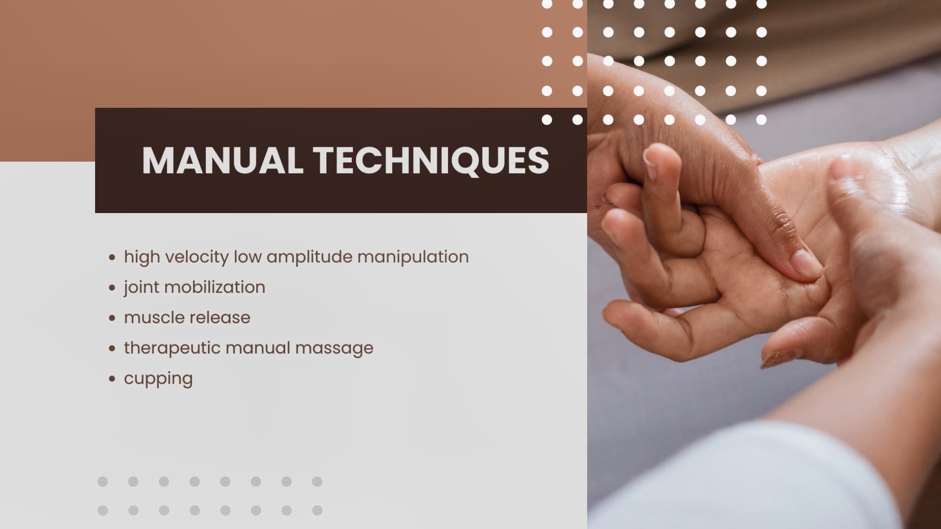• Manual techniques like high velocity low amplitude manipulation, joints mobilization, muscle release therapy, therapeutic manual massage, cupping and remedial excercises